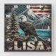 Ein majestätischer Glatzadler auf einem Ast, umgeben von mächtigen Bergen und üppigen Bäumen, Set vor einem pulsierenden Hintergrund der amerikanischen Fahne.