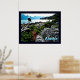 Ein digitales Gemälde eines Glatzenadlers, der auf einem Treibholzholz steht und an der felsigen Küste von Alaska gespült wird; in der Ferne lauern die Berge. Es erscheint auch das Textlesen "Alaska".