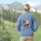 Auf der Rückseite dieser patriotischen Denim-Jacke steht ein Künstlerbild eines majestätischen amerikanischen Glatzenadlers vor der Flagge der US Flagge. Am unteren Rand des Bildes ist fett weißer Text, der sagt "MERICA.