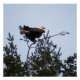 Ein Foto eines American Bald Eagle hoch oben auf einem Kiefernbaum.