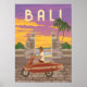 Vintages Reiseplakat von Bali. Die Sonne geht hinunter, ein abenteuerliches Mädchen auf einem Rollerrad mit Surfbrett auf der Straße vor dem Strand von Kuta-Legian mit seinem traditionellen balinesischen Tor. Original Illustration von Nasir Udin für Vectro Poster Co.