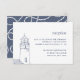 La carte d'enceinte de réception de style côtier romantique comprend vos détails de réception (timing, lieu et adresse) en bleu marine classique, ainsi qu'une illustration de phare dessinée à la main de style vintage. Les cartes s'inversent vers un motif de corde nautique blanc sur le bleu du port.