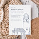 L'invitation à dîner de répétition chic côtier comporte une illustration de phare dessinée à la main de style vintage, avec les détails de votre dîner de répétition en bleu marine classique. Parfaits pour les répétitions et célébrations de plage, d'été ou nautiques, ces invitations de style côtier renversent vers un motif de corde nautique en blanc sur le bleu du port.