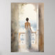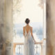Dieses ruhige und evokative Aquarellwerk vereint einen Augenblick ruhiger Kontemplation. Eine junge Frau, elegant in einem langen weißen Kleid, steht auf einem Balkon, ihr Blick verloren in der weiten Weite des Meeres, die sich vor ihr ausdehnt. Die Szene ruft ein Gefühl des Friedens, der Sehnsucht oder vielleicht hoffnungsvoller Vorfreude hervor, während sie auf den fernen Horizont blickt. Die weiche, fließende Aquarelltechnik verstärkt die sanfte Atmosphäre, das Lichtspiel auf dem Wasser und die anmutige Kleidung. Ein zeitloses Stück, das jedem Raum eine beruhigende und erstrebenswerte Atmosphäre verleiht.