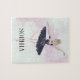Ein spezielles Ballettpuzzle für die Ballerina. Das Design ist leicht personalisiert, indem Sie Ihren eigenen Namen eingeben. Eine Ballerina in einem blauen Tutu ist auf einem rosa marmorierten Hintergrund zu sehen.