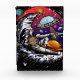 Originelle Vektorkunst eines Astronauten, der einen Mondkäse hat und eine Scheibe an eine Alien übergibt. Erstellt in Vektor.