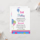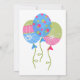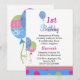 Une invitation à la fête d'anniversaire pour bébé élégante, avec des graphiques colorés de ballons bleu, rose et vert en motif amusant et une bordure de pois colorée, en bas. Un texte graphique coloré, en haut, indique Anniversaire, avec un ballon à pois fixé. Personnalisez le texte rose et noir pour votre célébration spéciale.
