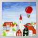 Einzigartig fröhliche Kunst, die jedes Kinderzimmer, jede Vorschule oder jedes Kinderzimmer aufheitert! Maus schwebt in ihrem Heißluftballon über den Dächern einer Stadt. Fragment von Balloon Mouse & Roofs painting by s t u d i o L e n n A r t t www.studiolennart.com