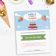 Ein farbenfroher Flyer für Party- und Eventplaner, verziert mit einer Geburtstagstorte, einigen Wolken an einem blauen Himmel und farbenfrohen Ballons. Geeignet für Eventorganisatoren, die für die Organisation verschiedener Veranstaltungen verantwortlich sind, darunter Geburtstagsfeiern für Kinder und Erwachsene, Produkteinführungen, Babypartys, Familienfeiern, Hochzeitstage, Junggesellenabschiede und Themenpartys.