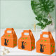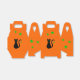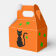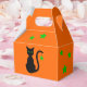 Caricature en silhouette d'un chat noir aux yeux verts sur un arrière - plan orange. Une étoile verte est suspendue à la queue du chat. D'autres étoiles vertes décorent le reste de la boîte.