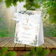 Un arrière - plan blanc décoré de verdure d'eucalyptus et de feuilles dorés, de poussière de parties scintillant en faux or et d'une croix dorée. Avec le texte : Baptême et Merci. Personnalisez et ajoutez un nom. Non sexiste.