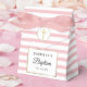 Avec un fond à rayures rose et blanc élégant, cette boîte de baptême ou de christening favorisée comporte une bordure de faux or élégante encadrant les détails de votre événement dans une typographie chic et un message de remerciement spécial au verso. Conçu par Thisisnotme©