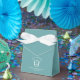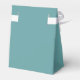 Cette boîte de faveurs de mariage présente une crête monogrammée classe en blanc sur un arrière - plan bleu turquoise. Utilisez les champs modèle pour ajouter vos informations personnalisées. Pour voir la suite de papeterie mariage élégante correspondante visitez www.zazzle.com/dotellabelle