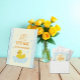 Un canard chanceux ! Premier anniversaire avec canard en caoutchouc et bulles contre un en vichy bleu clair et arrière - plan jaune pâle avec texte orange
