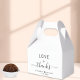 Chic boîte de faveur de mariage avec "amour + merci" en typographie moderne simple et un script élégant avec des swashes, vos prénoms unis par un coeur et votre date mariage.