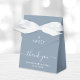 Chic boîte de faveur de mariage bleu poussiéreux avec "un gentil merci" dans un mélange de typographie blanche simple et un élégant script blanc avec des swashes, vos prénoms unis par un coeur et votre date mariage.