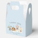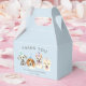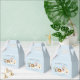 Ballotin mignon pour la fête d'anniversaire du chiot de votre enfant. Illustration de 4 chiens (dalmate, beagle, pit bull terrier) avec casquettes de fête. Le texte dit "merci d'être venu à ma paille." Customisez ce produit en ajoutant le nom de votre enfant au bas de la conception.