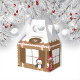 Café brun mignon avec une fille pingouin à l'avant, bonhomme de neige à l'arrière, fille en pain d'épice et rennes avec des caractères de cacao chaud de chaque côté. Panneau café sur le rabat avant avec un modèle de nom personnalisé au-dessus. Cerise en rack et bonbons de menthe poivrée ornent l'extérieur. Parfait pour les échanges de mélange de cacao chaud !