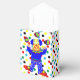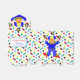 Un mignon clown de cirque jonglant assis sur un ballotin blanc à pois coloré. Idéal pour les fêtes d'enfants, n'oubliez pas de personnaliser le texte avec vos détails.