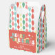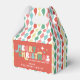 Groovy retro 60s inspired Christmas favor box with Merry Christmas written in a fun retro font against a coral red background. The rest of the box is printed in a groovy pattern resembling Christmas ornament baubles. A fun way to hand out Christmas favors at your Christmas party with a retro feel.