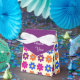 Retro style pattern of blue, pink, purple and orange penny flowers.