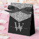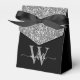 Boîte de faveur personnalisée élégante moderne féminine noir et argenté avec monogramme personnalisé, nom initial, signature, écriture. Ce design présente votre prénom dans un joli style de lettrage manuscrit avec une queue en forme de paraphe, une typographie de signature (ou calligraphie) avec monogramme initial, sur un bloc de paillettes de couleur gris argenté faux sur fond noir. Ces boîtes-cadeaux féminines élégantes sont idéales pour offrir des cadeaux, des cadeaux pour les invités et des friandises lors d'une fête d'anniversaire imminente, d'un barbecue, d'un anniversaire de 16 ans, d'une baby shower, d'une réception de mariage, d'une soirée d'enterrement de vie de jeune fille, d'une douche de mariée, d'un anniversaire de mariage et plus encore.