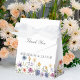 Pretty wildflowers decorate the bottom of this colorful spring wedding favor box. Watercolor floral borders are perfect for a garden ceremony outdoors while flowers are in bloom. Elegant script dances above a beautiful orange, purple, yellow, and blue botanical meadow on these custom boxes.