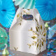 Une boîte cadeau de Noël festive avec un motif de flocons dorés éparpillés sur un arrière - plan métallique en argent pour ajouter une touche de classe et de style à votre cadeau de Noël de cette année.