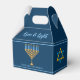 Cute custom Love and Light Hanoukka party boîte de faveur pour les cadeaux de famille juive à un parti Chanukah ou une synagogue. Personnalisez avec votre nom de famille ou informations de groupe en bleu autour de la jolie menorah or et bleu.