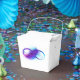 Infinity symbole with a beautiful feather painted in purple and blue bright colors on white background