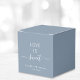 Chic boîte de faveur de mariage bleu poussiéreux avec "l'amour est doux" dans une simple typographie blanche et un élégant script de calligraphie blanche avec des swashes, vos prénoms unis par un coeur et votre date mariage.