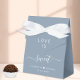 Un ballotin bleu poussiéreux pour votre mariage qui présente "L'amour est doux" dans une simple typographie blanche et un élégant script de calligraphie blanche avec des swashes, vos prénoms unis par un coeur et votre date mariage.