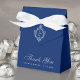 Une boîte de faveur de mariage bleu royal. Sur le rabat, il y a un blason en faux foil argenté avec un monogramme à l'intérieur, composé de 2 initiales. Le message Merci est écrit dans la partie inférieure, dans un script gris élégant, l'occasion et la date sont écrites en majuscules en dessous. Le fond est bleu royal.