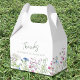 Jolie prairie botanique esquissée aquarelle florale mariage faveur grâce boîte de noms personnalisés. Joli ballotin blanc avec joliment entrelacé avec une sélection de croquis fleurs sauvages mignons avec des petites abeilles. Les fleurs et les abeilles sont dessinées à la main et peintes en aquarelle. Design floral sur le blanc avec des tons colorés, vert, bleu, violet, mauve et doux pêche et jaunes. Personnalisez avec vos propres noms de couples. D'autres éléments correspondants sont disponibles ou peuvent être créés sur demande. Art et design d'aquarelle peint à la main par Sarah Trett pour www.mylittleedenwedding.com