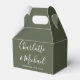Elégant ballotin de mariage avec des noms chic de script signature et date spéciale sur un arrière - plan vert olive. Vous pouvez personnaliser avec votre propre message de remerciement au contraire. Une façon parfaite de remercier vos invités ! Conçu par Thisisnotme©