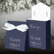 Simple et élégant boîte de mariage bleu marine avec des noms de script de signature stylisés et date spéciale dans la typographie moderne. Vous pouvez personnaliser avec votre propre message de remerciement sous le couvercle. Une façon parfaite de remercier vos invités ! Conçu par Thisisnotme©