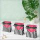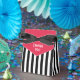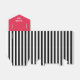 Cette boîte de faveur Derby a un fond rayé noir et blanc avec un rabat rouge qui dit "Merci" en blanc.