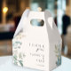 Une boîte raffinée de mariage avec d'élégantes illustrations en feuilles botaniques dans les tons vert muet, beige et or. Le script moderne "Merci" ajoute une touche chaleureuse, tandis que vos noms et votre date personnalisent le design. Idéal pour des fêtes mariages et de plein air d'inspiration nature et élégantes.