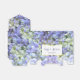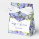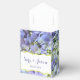 Cette boîte de tente de mariage avec ruban blanc présente une photo d'hydrangées violettes à fleurs entières. Une boîte blanche en forme de support sur le devant sous le rabat contient du texte personnalisable pour les noms de la mariée et du marié et leur date de mariage.