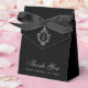 Une boîte de faveur de mariage en noir et argent. Sur le rabat, il a une fausse écusson argentée avec un monogramme dedans, à partir de 2 initiales. Le Merci de message est écrit dans la partie inférieure, dans un élégant script gris, l'occasion et la date sont écrits en casquette sous elle. L'arrière - plan est noir.