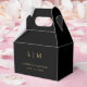 Un Ballotin de mariage simple mais élégant avec un design minimaliste moderne avec votre monogramme de deux lettres avec vos noms et votre date. Tous les éléments de conception sont en faux or sur un arrière - plan noir et peuvent être changés dans l'outil d'édition de conception. Ces boîtes de Faveur Mariage classique vont bien avec n'importe quel style de mariage.
