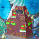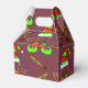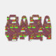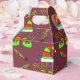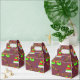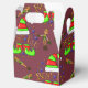 Un ballotin de Noël mignon avec un motif de petits elfes de Noël fantaisistes, avec des chapeaux de Père Noël géants et des chaussures pointues en vert et rouge. Ils sont entourés de flocons de neige bleus et d'étoiles dorées.