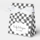 These personalized boxes are perfect for wedding and party favors. The boxes have an all over checkerboard pattern of white and black painted squares. Your names and wedding date appear on the front of the box in a white oval shaped frame.
