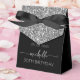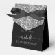 Girly Elegant Moderne Design Parties scintillant Argent Monogramme Nom Signature Script Personnalisé Ballotin d'anniversaire de 30e (ou de n'importe quel âge). Ce design qui met en vedette votre prénom dans un joli style écrit à la main la typographie de signature de la queue d'écharpe (ou calligraphie) au-dessus du faux bloc de parties scintillant gris argent sur l'arrière - plan noir. Ces boîtes-cadeaux élégantes et féminines, idéales pour distribuer, cadeaux, cadeaux d'hôtes et gâteries pendant une fête d'anniversaire à venir, réception de mariage, baby shower, soirée bachelorette, barbecue, douche nuptiale, 16 ans, anniversaire et plus.