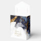 Un arrière - plan abstrait qui évoque le marbre dans les tons bleu marine veiné d'or brillant est la toile de fond de textes élégants et de mises en page design moderne dans les pièces de cette belle suite mariage. La boîte de faveur de mariage montrée ici comprend le texte de script courant ci-dessus plus optionnel de 'Love & Thanks' et un modèle pour ajouter les noms de la mariée et du marié et la date du mariage. Recherchez ID644 pour voir toutes les pièces de coordination de cet ensemble.