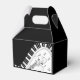 Clavier noir et blanc classique avec un flair incurvé. Des notes musicales rajoutées ajoutent un aspect festif.