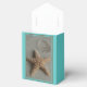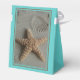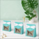 Ces boîtes de mariage sur le thème de la plage présentent une photo d'une étoile de mer dans le sable comme point focal avec une empreinte d'un coquillage. La photo est entourée d'une belle couleur aqua et un joli ruban blanc est utilisé pour fermer le ballotin avec les mots "Merci" apparaissant juste en dessous du ruban. Un beau ballotin pour une réception de mariage sur le thème de la plage. Droit d'auteur