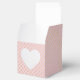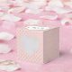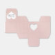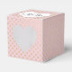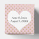 Cœur blanc avec les noms des jeunes mariés sur fond rose blush et motif de points dorés scintillants.