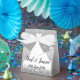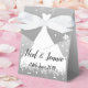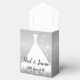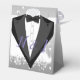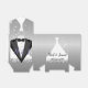 Robe nuptiale et boîtes de faveur de mariage à thème tuxedo. Conception personnalisée avec nom et date.