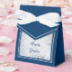 Une plage de sable avec des brins de mer photo centrale pour une destination romantique mariage. Les ballotins dans une marine propre et blanc apportent un peu de l'ambiance côtière à la table de faveur. La typographie élégante apporte une touche finale.